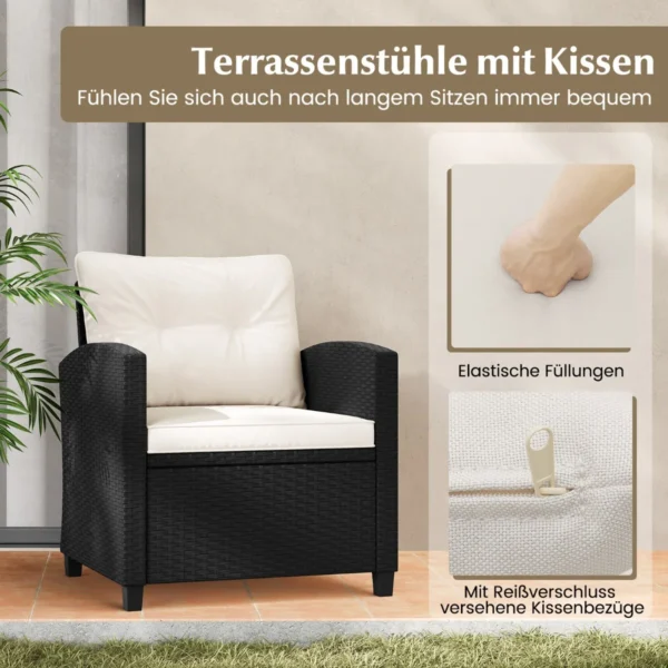 - Juodas PE rotangas, atsparus saulės poveikiui ir blukimui.