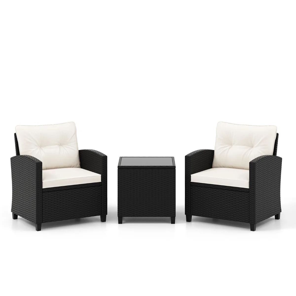 Sodo baldų komplektas iš 3 dalių, juodos ir baltos spalvos, skirtas patogiam poilsiui lauke. Komplektą sudaro dvi kėdės ir kavos staliukas, pagaminti iš ilgaamžio PE rotango, atsparaus saulės spinduliams ir blukimui. Baldų komplektas puikiai tinka naudoti sode, prie baseino ar terasoje.