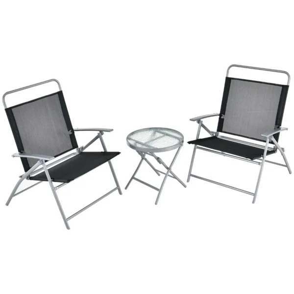 Sodo baldų komplektas iš 3 dalių, juodos ir sidabrinės spalvos, puikiai tinka lauko poilsiui terasoje, kieme ar balkone. Komplektas susideda iš dviejų sulankstomų kėdžių su plačiomis sėdynėmis ir praktiško kavos staliuko, pagaminto iš tvirto metalo ir grūdinto stiklo.