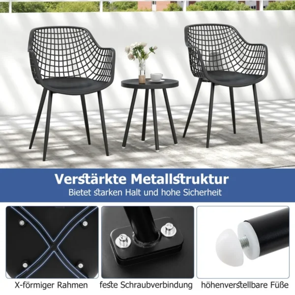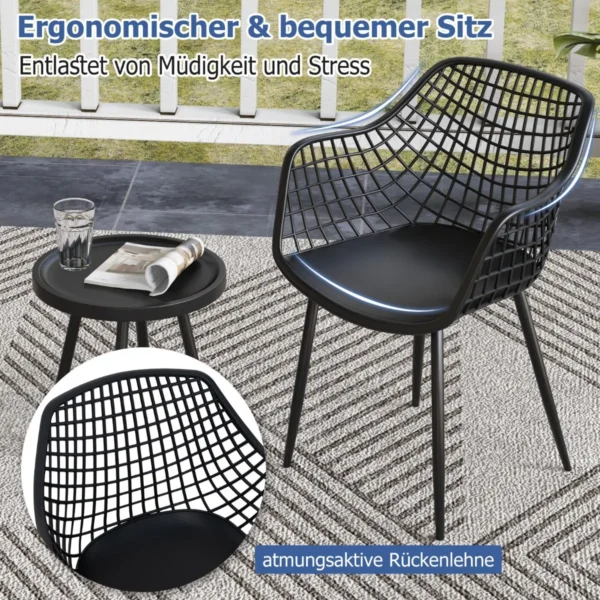 Sodo baldų komplektas iš 3 dalių, juodos spalvos – praktiškas sprendimas lauko erdvėms. Šis 3 dalių lauko baldų rinkinys užtikrina komfortą ir ilgaamžiškumą, tinkamas terasoms, kiemams ar verandoms. Komplektas apima dvi ergonomiškas kėdes ir apvalų kavos staliuką su įgaubtu stalviršiu.