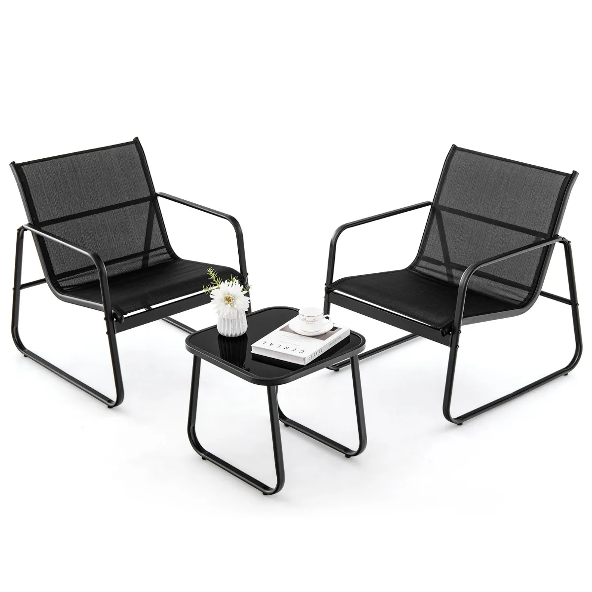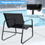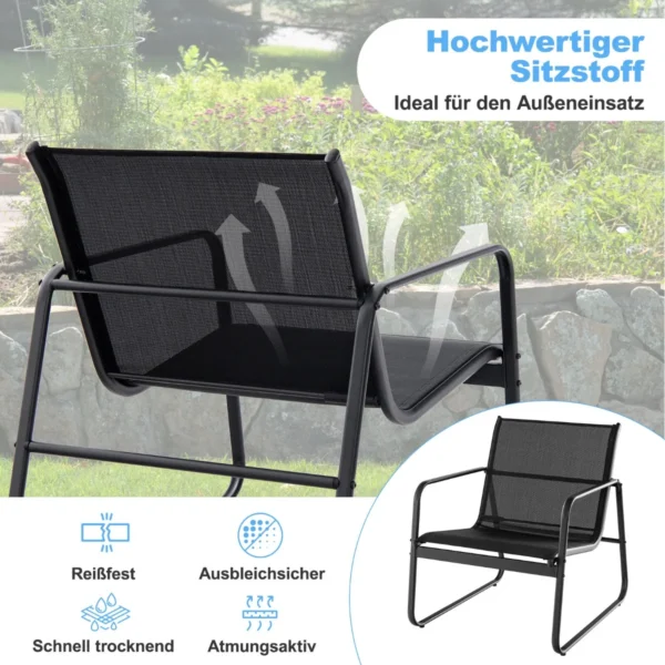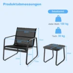 Sodo baldų komplektas iš 3 dalių, juodos spalvos, puikiai tinka lauko erdvėms kaip sodas, terasa ar baseino zona. Šis metalinis pokalbių rinkinys užtikrina patogumą ir stabilumą lauko sąlygomis, o funkcionalus kavos staliukas leidžia patogiai laikyti gėrimus ar užkandžius.