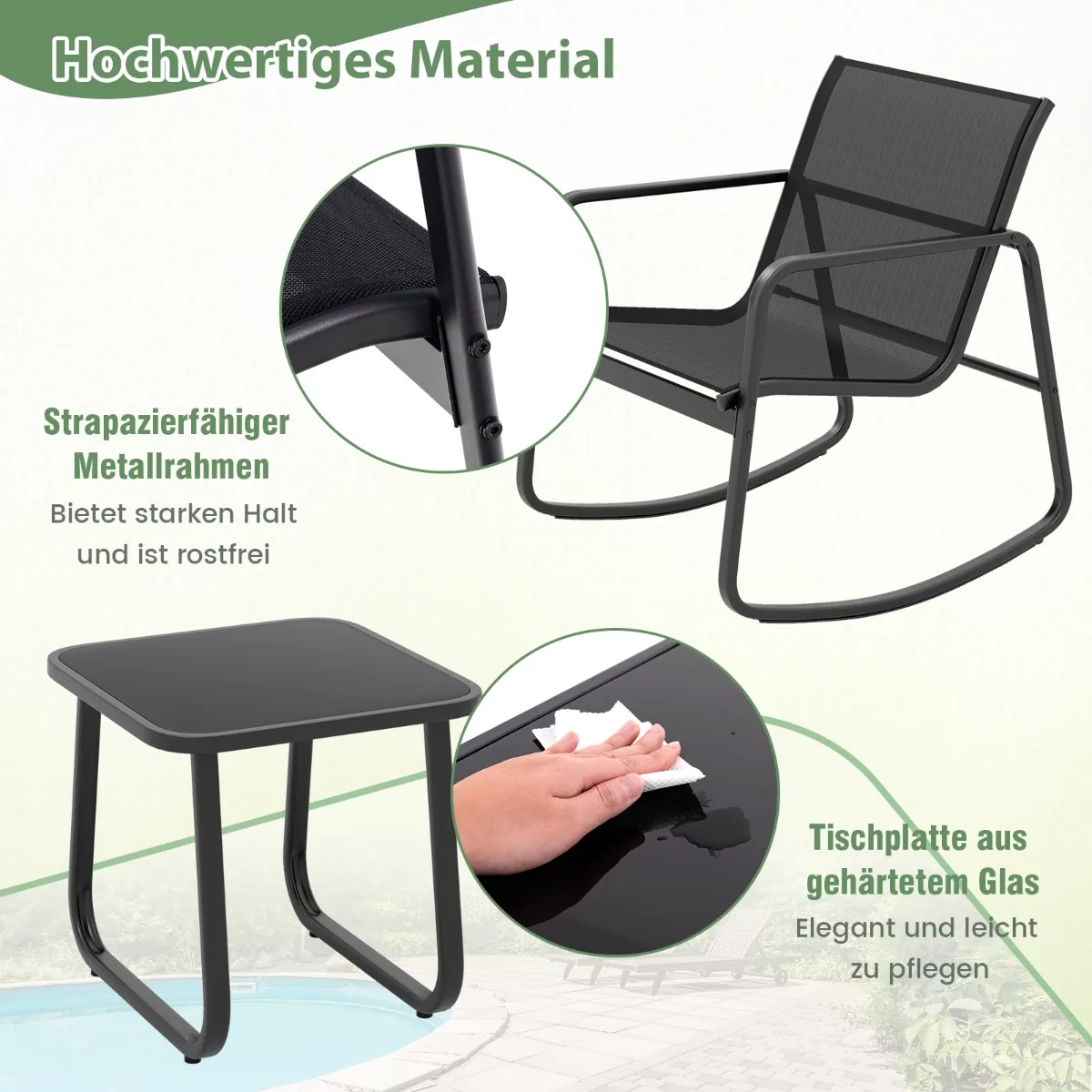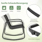 Sodo baldų komplektas iš 3 dalių, juodos spalvos, puikiai tiks jūsų terasai, sodui ar balkonui. Komplektą sudaro dvi supamosios kėdės ir šoninis staliukas, kurie užtikrina patogumą ir funkcionalumą lauko sąlygomis. Tvirtas metalinis rėmas ir greitai džiūstantis audinys suteikia ilgalaikį patvarumą.