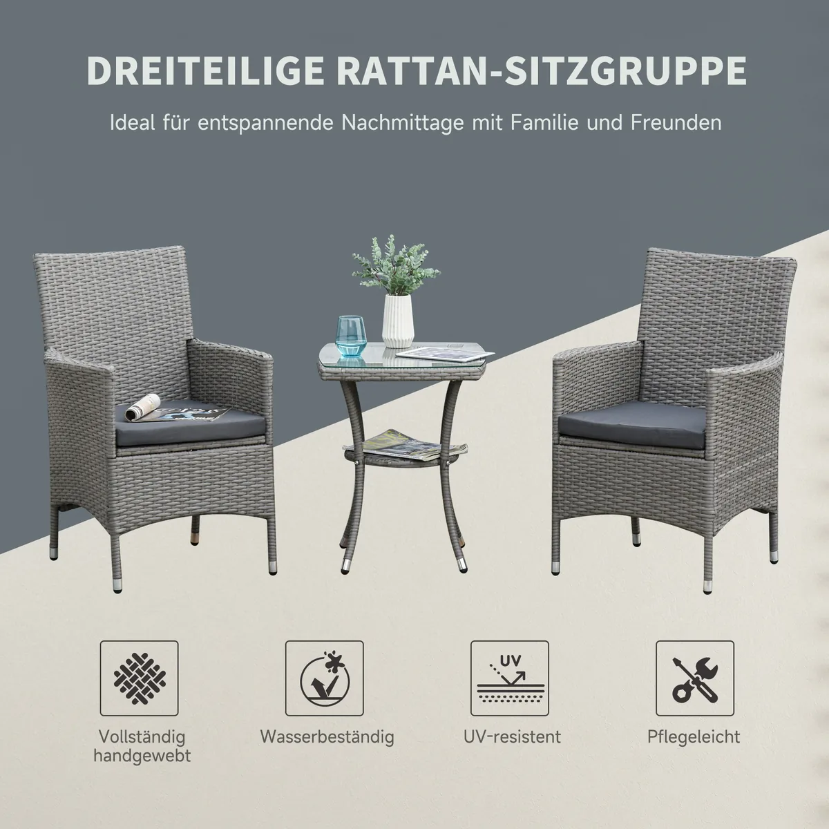 Su šiuo balkono baldų komplektu dviems žmonėms iš Outsunny savo kiemui ir balkonui suteiksite stiliaus ir komforto. Ratano baldų balkoną sudaro dvi kėdės ir stalas su grūdinto stiklo stalviršiu. Į pristatymą taip pat įeina dvi storos paminkštintos pagalvėlės su skalbiamais užvalkalais. Naudodami balkono baldus tikrai patogiai galėsite pasimėgauti gerdami kavą ar vyną.