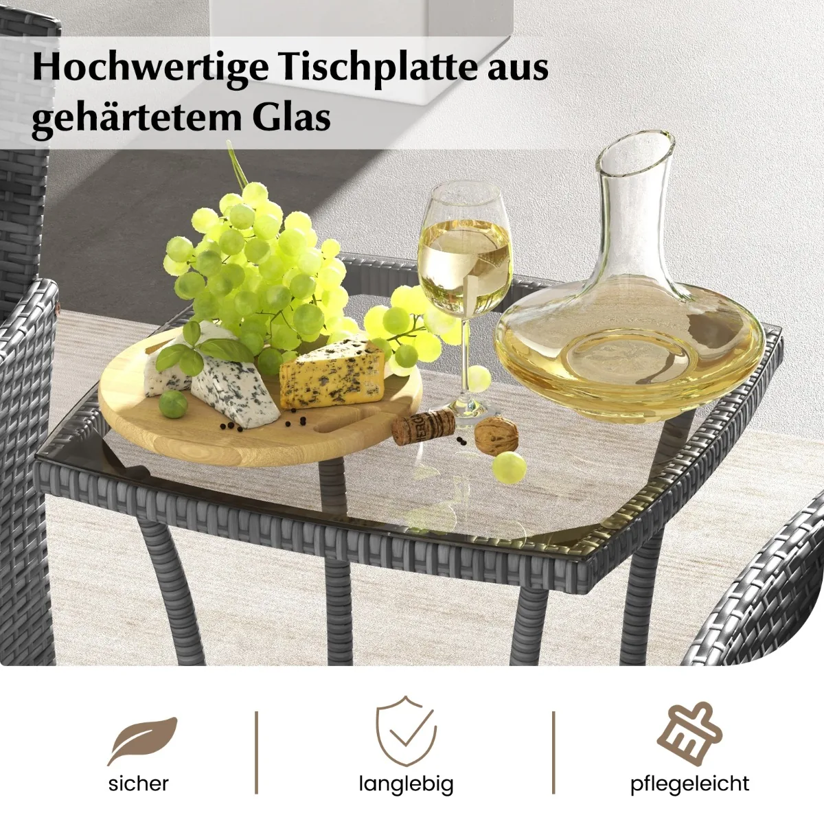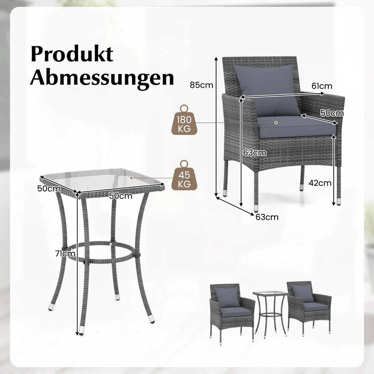 Sodo baldų komplektas iš 3 dalių, pilkos spalvos, skirtas patogiai ir praktiškai lauko erdvei įrengti. Komplektą sudaro dvi pintos PE rotango kėdės su pagalvėlėmis ir kvadratinis kavos staliukas su grūdinto stiklo stalviršiu. Šis lauko baldų rinkinys puikiai tinka balkonams, terasoms ar mažoms kiemo erdvėms.