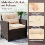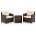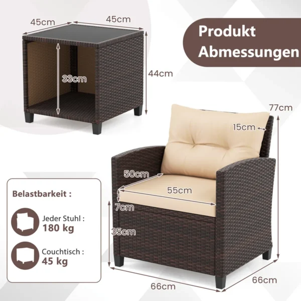 Sodo baldų komplektas iš 3 dalių, rudos spalvos, pagamintas iš rankomis austo PE rotango, skirtas naudoti lauko erdvėse. Komplekte yra dvi kėdės su patogiomis pagalvėlėmis ir kavos staliukas su grūdinto stiklo stalviršiu. Šis rotango baldų rinkinys tinka sodui, balkonui ar poilsio zonai prie baseino.