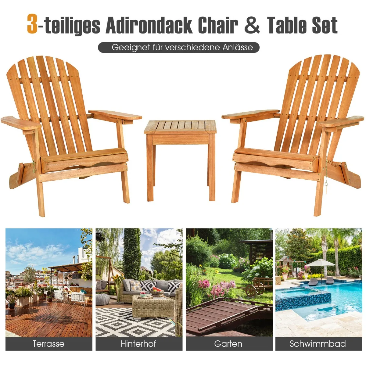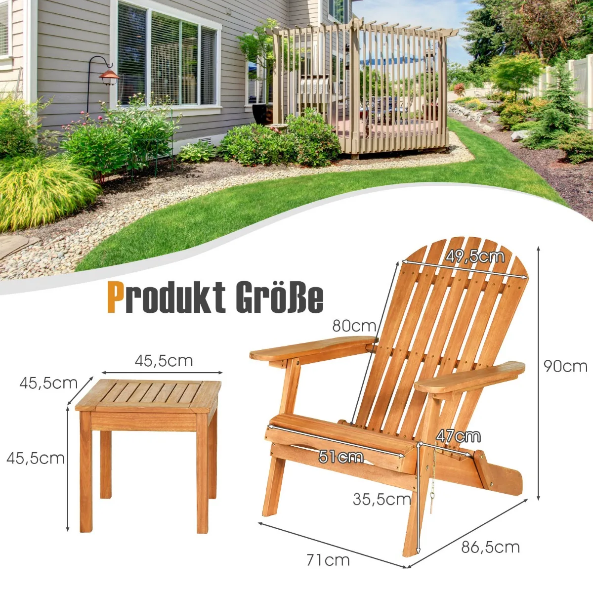 Sodo baldų komplektas iš 3 dalių, šviesiai rudos spalvos, skirtas lauko poilsiui. Komplektą sudaro dvi eukalipto medienos Adirondack kėdės ir kvadratinis šoninis staliukas, tinkantis naudoti sode, terasoje ar prie baseino. Baldų dizainas užtikrina patogumą ir ilgaamžiškumą įvairiomis oro sąlygomis.