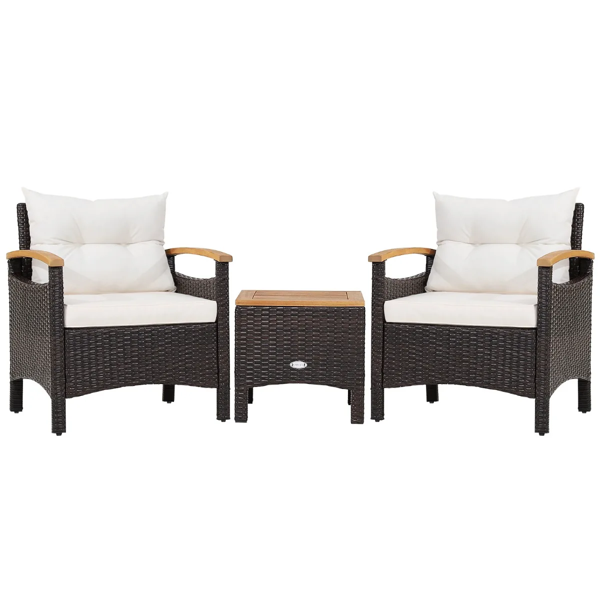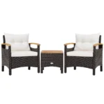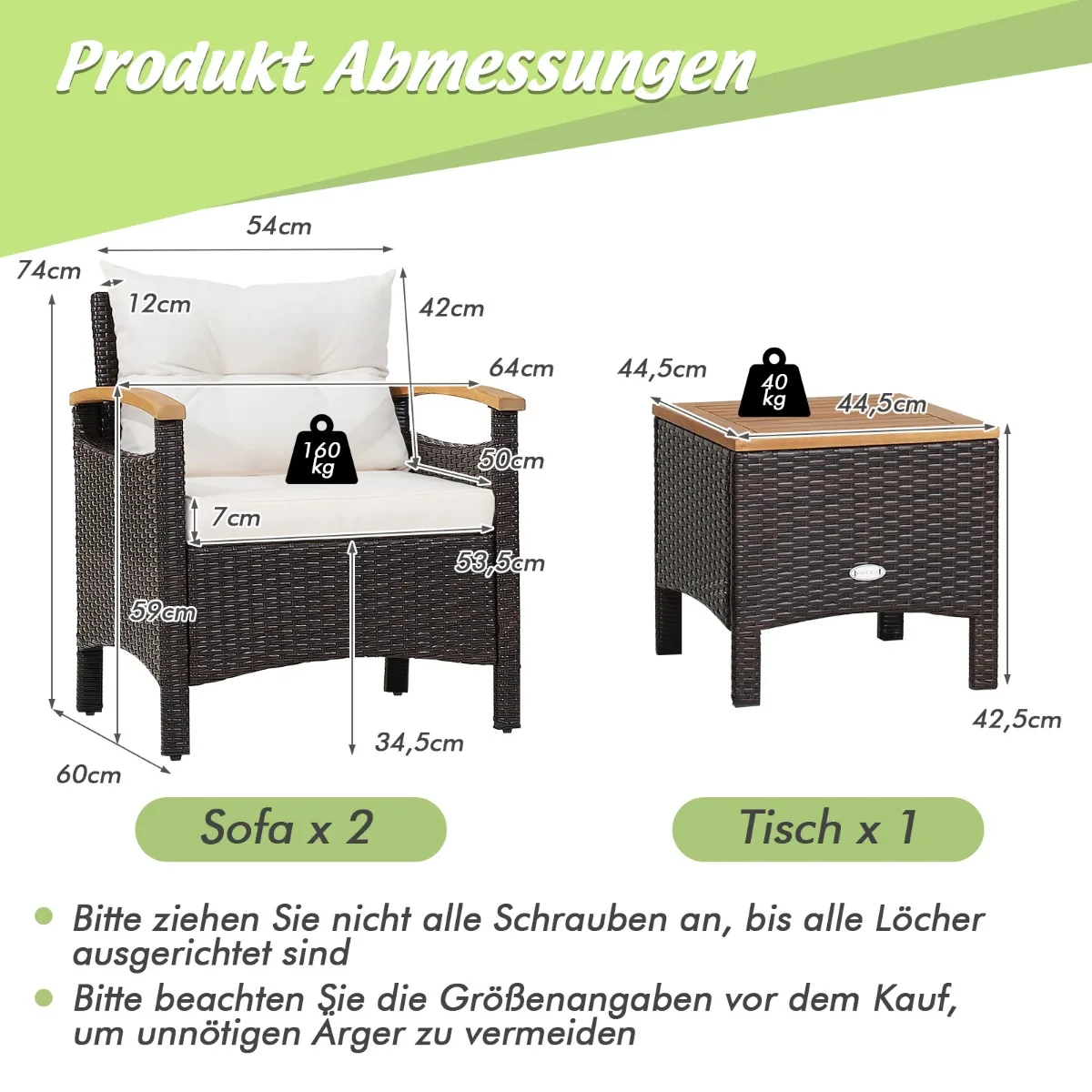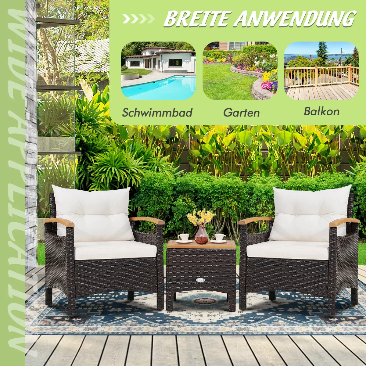 Sodo baldų komplektas iš 3 dalių, tamsiai rudos ir baltos spalvos, puikiai tinka terasai, sodui ar balkonui. Komplektą sudaro dvi kėdės su patogiomis pagalvėlėmis ir praktiškas kavos staliukas, pagaminti iš atsparių lauko sąlygoms medžiagų. Šis lauko baldų rinkinys užtikrina komfortą ir ilgaamžiškumą.
