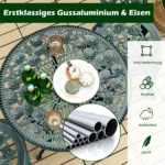 Sodo baldų komplektas iš 3 dalių, žalios spalvos, puikiai tinka naudoti lauke sode, terasoje ar balkone. Komplektas apima stalą ir dvi kėdes, pagamintas iš patvaraus ketaus ir aliuminio, atsparaus oro sąlygoms. Tai praktiškas sprendimas maistui, kavos pertraukėlėms ar poilsiui lauke.
