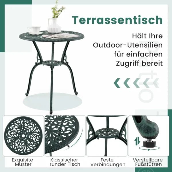 Sodo baldų komplektas iš 3 dalių, žalios spalvos, puikiai tinka lauko poilsiui, terasai ar sodui. Komplektas pagamintas iš lietaus aliuminio, kuris užtikrina atsparumą oro sąlygoms ir lengvą priežiūrą. Į komplektą įeina stalas su skėčio anga bei dvi patogios kėdės su atlošais.
