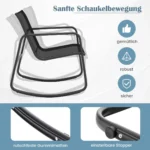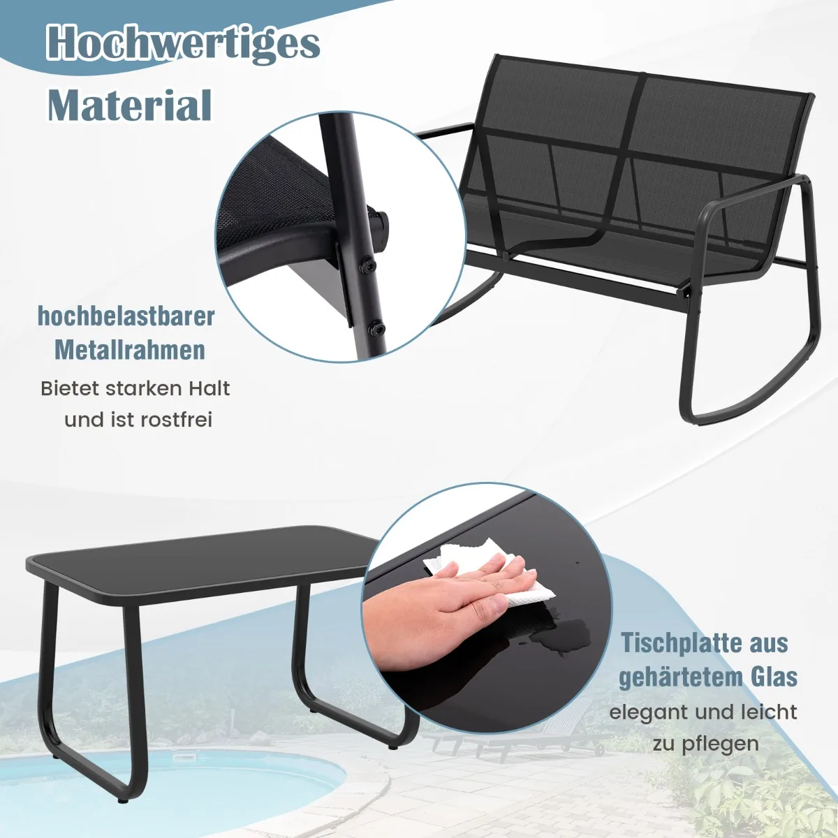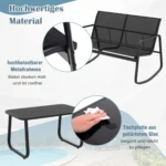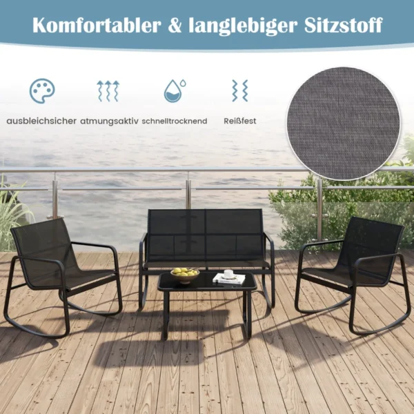 Sodo baldų komplektas iš 4 dalių juodos spalvos puikiai tinka terasoms, kiemams ar balkonams. Šis komplektas apima supamąsias kėdes, meilės sėdynę ir kavos staliuką, kurie užtikrina patogumą bei tvirtumą lauke. Dėl metalinės konstrukcijos ir patvarios medžiagos rinkinys atsparus rūdims ir ilgalaikiam naudojimui.