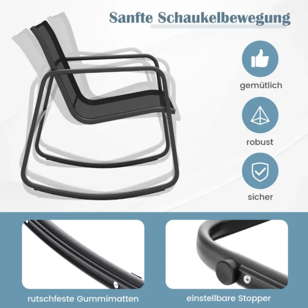 - Tvirtas pagrindas su neslystančiais guminiais kilimėliais ir reguliuojamais kamščiais leidžia supamosioms kėdėms švelniai siūbuoti.