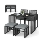 - Ergonomiškas dizainas leidžia pufus pakišti po foteliais, o sulankstomi atlošai užtikrina kompaktišką laikymą po stalu.