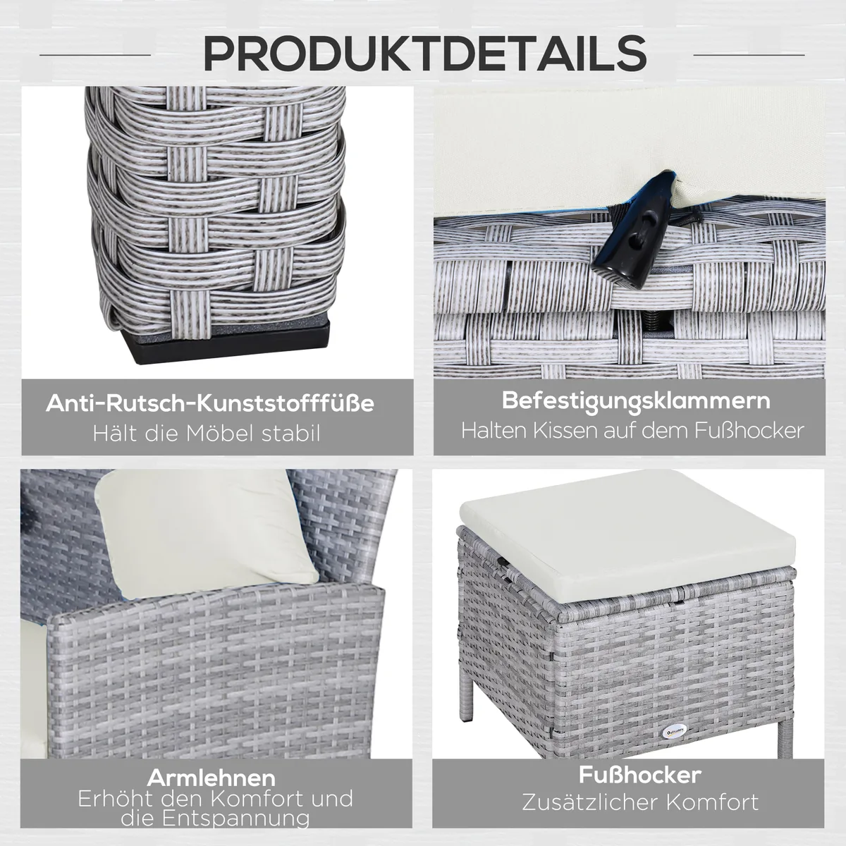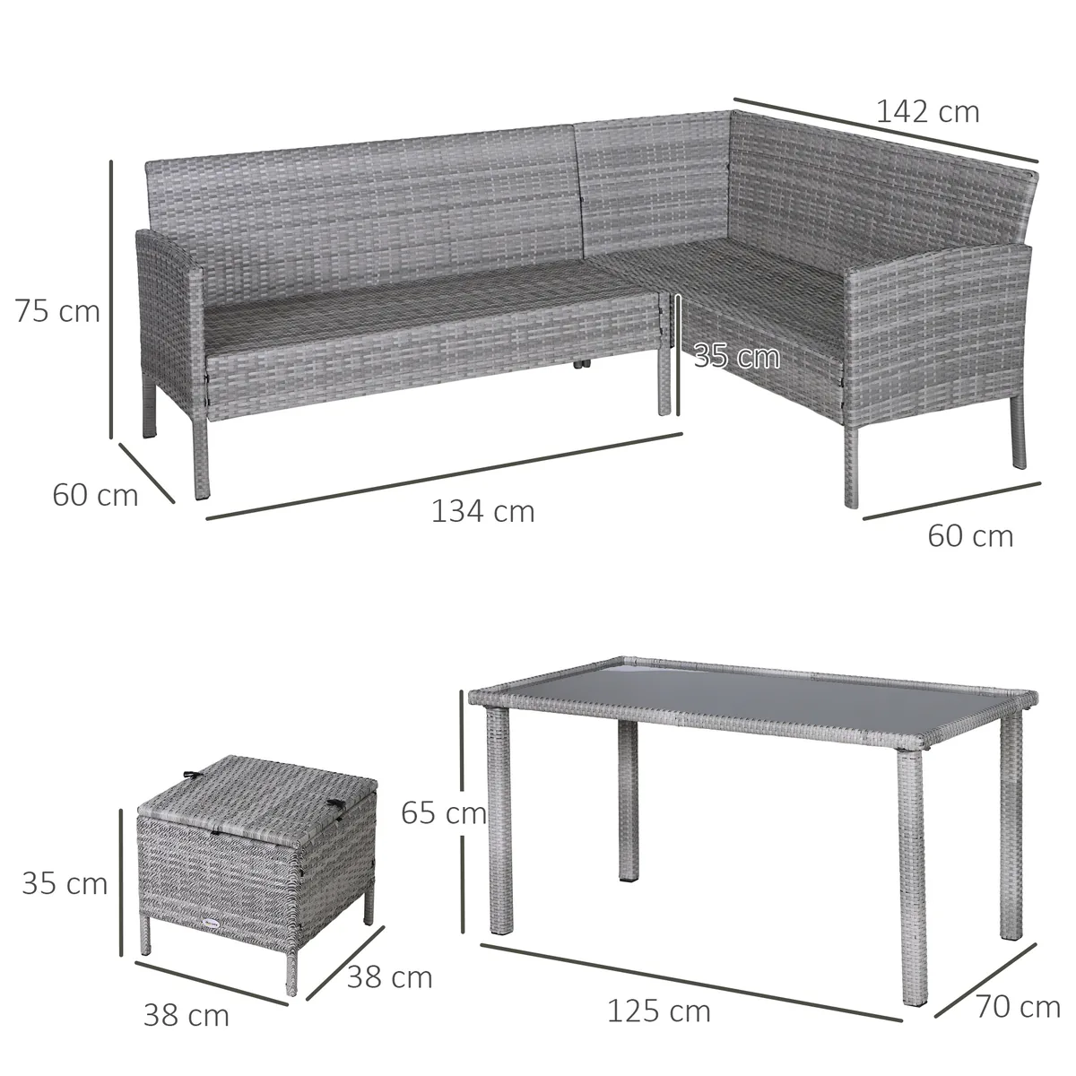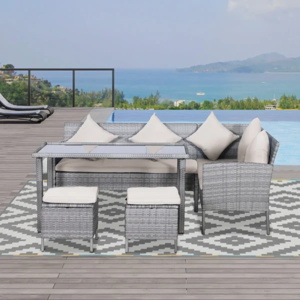 Su penkių dalių polirotango sėdynių grupe iš Outsunny galite papuošti savo terasą, sodą ar net žiemos sodą. Plastikinis tinklelis su rotango išvaizda yra stabilus ir atsparus oro sąlygoms. Valgomojo stalas turi grūdinto stiklo stalviršį. Šioje sėdimoje zonoje tikrai galėsite jaustis patogiai su šeima ir draugais.