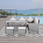 ✔ 5 dalių sodo baldų komplektas, kurį sudaro dvivietė su porankiu, dvivietė su porankiu ir šonine dalimi, dvi kėdės ir valgomojo stalas