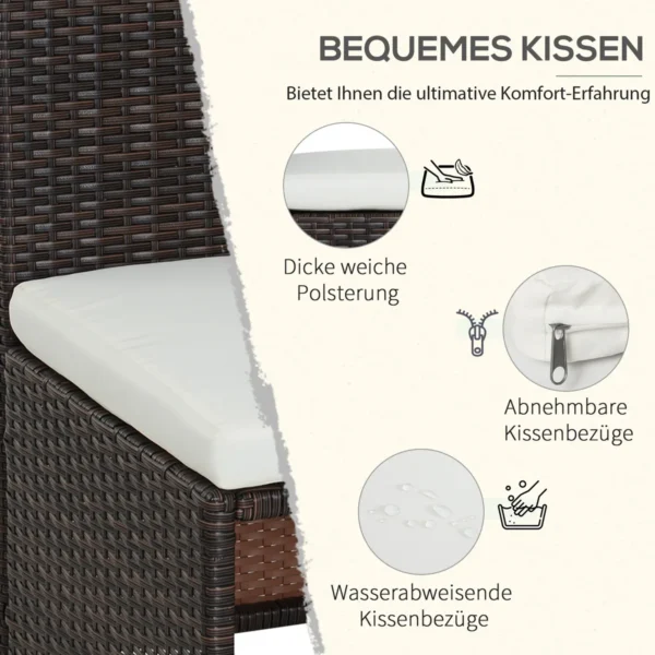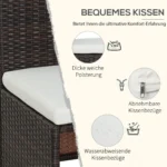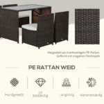 Šis 5 dalių Outsunny sodo baldų komplektas yra padengtas patvaria, patvaria polirotango vytele, kuri yra ypač atspari oro sąlygoms ir tvirta, todėl rinkinys idealiai tinka ilgalaikiam naudojimui lauke. Stalviršis pagamintas iš tvirto saugaus stiklo ir yra ypač lengvai valomas. Dėl gausaus paminkštinimo ir keturių pagalvėlių galite patogiai atsipalaiduoti ir mėgautis ramybe ir ramybe sode su karštu gėrimu ir dideliu komfortu.