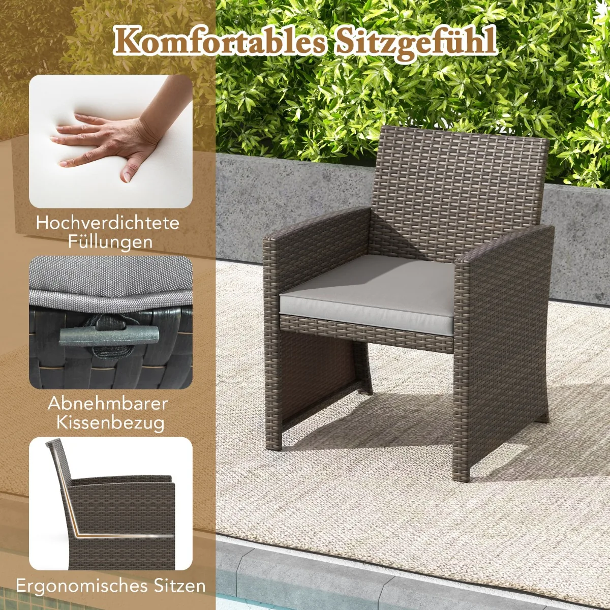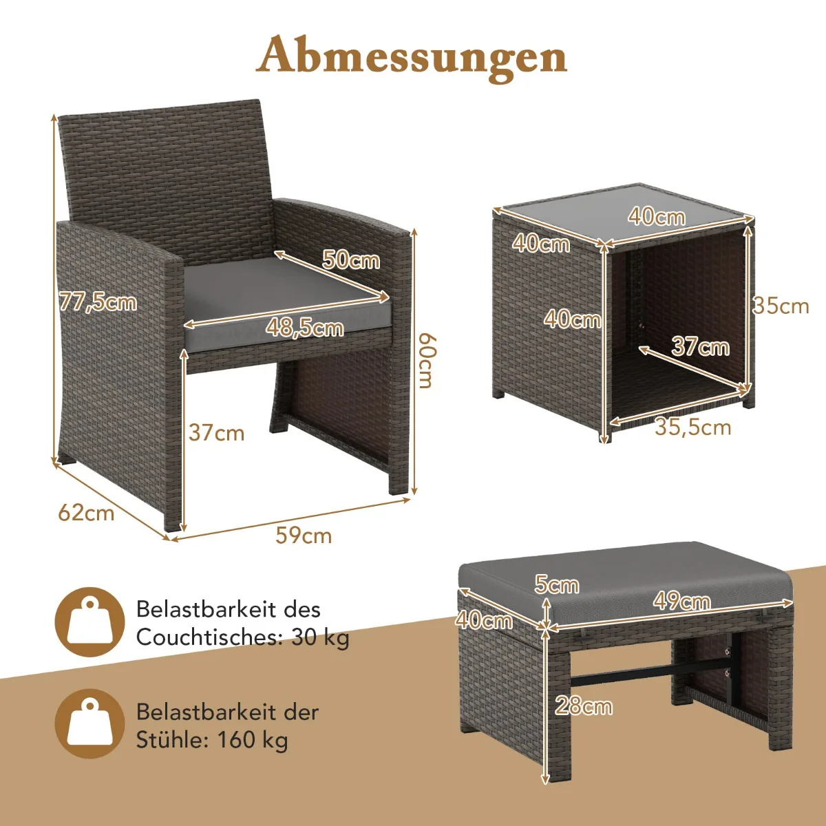 Sodo baldų komplektas iš 5 dalių, rudos/pilkos spalvos, puikiai tiks lauko erdvėms. Komplektą sudaro foteliai, pufai ir kavos staliukas su stikliniu stalviršiu, pagaminti iš orui atsparaus PE rotango. Šis komplektas yra patvarus, patogus ir lengvai prižiūrimas, todėl tinkamas naudoti terasoje, sode ar prie baseino.