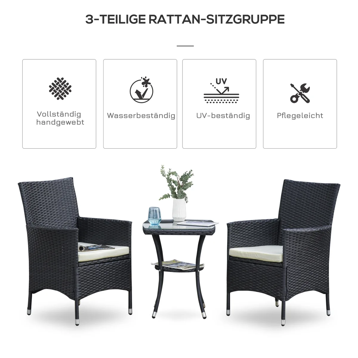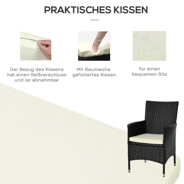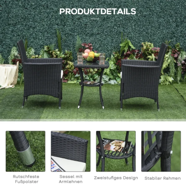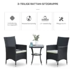 Su šiuo balkono baldų komplektu dviems žmonėms iš Outsunny savo kiemui ir balkonui suteiksite stiliaus ir komforto. Iš rotango atrodančio rotango holo komplektą sudaro dvi kėdės ir stalas su grūdinto stiklo stalviršiu. Į pristatymą taip pat įeina dvi storos paminkštintos pagalvėlės su skalbiamais užvalkalais. Naudodami sėdimąją erdvę galėsite tikrai patogiai įsitaisyti gerdami kavą ar vyną.