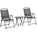 Trijų dalių Outsunny sodo baldų komplektą sudaro kavos staliukas su grūdinto stiklo stalviršiu ir dvi sulankstomos kėdės su porankiais. Bistro komplekto stalas ir kėdės pagaminti iš metalinio rėmo su milteliniu būdu dengtu paviršiumi, todėl yra stabilūs ir tvirti. Dėl sulankstomo balkono baldų komplekto dizaino stalą ir kėdes galima lengvai laikyti ir transportuoti. Idealus būdas mėgautis diena prie pat jūsų namų slenksčio su Outsunny.