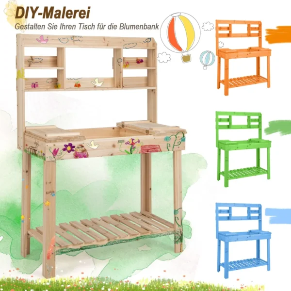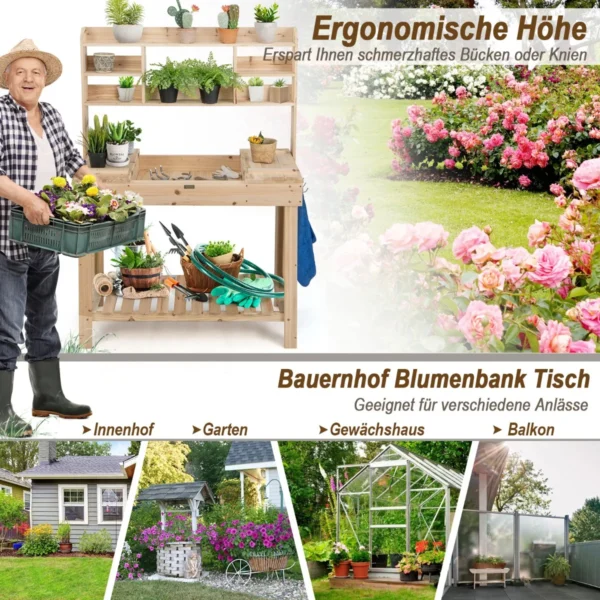 Sodo darbastalis 110x50x153 cm, šviesiai rudos spalvos, yra funkcionali darbo vieta jūsų sodui. Pagamintas iš natūralios eglės medienos, jis turi daug sandėliavimo vietų sodo įrankiams, augalams ir dirvožemiui. Ergonomiškas 86 cm aukštis sumažina nugaros bei kelių apkrovą dirbant lauke.