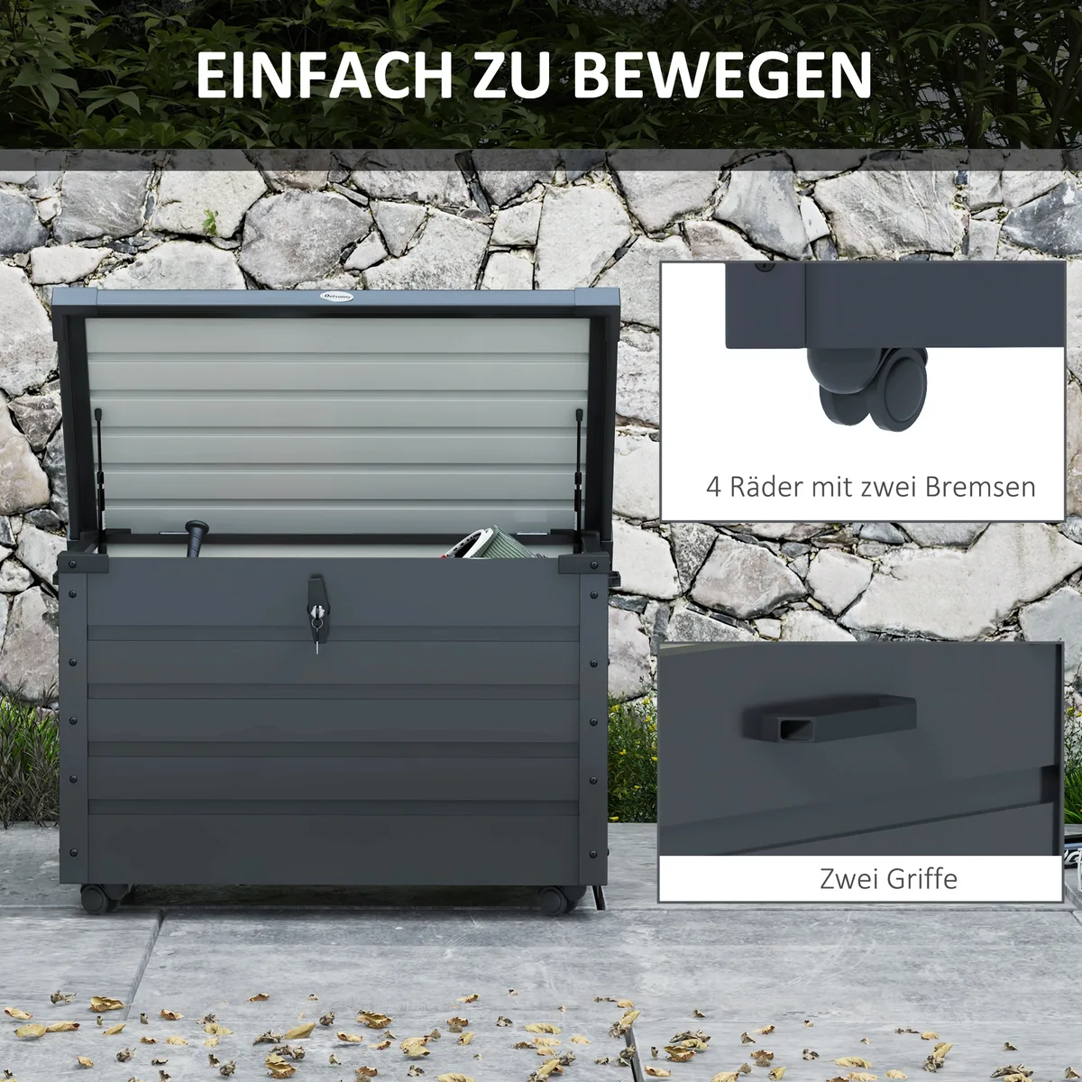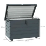 Outsunny sodo skrynia yra tvirtas metalinis laikymo sprendimas, skirtas naudoti lauke. 295 litrų talpos jame yra daug vietos sodo reikmenims, įrankiams ir dar daugiau. Pagaminta iš cinkuoto plieno, sodo laikymo dėžė yra tvirta ir turi lengvai atidaromą dangtį, kad būtų lengviau laikyti. Jame yra dvi rankenos ir ratai, kad būtų galima lengvai perkelti tuščią ar pakrautą.