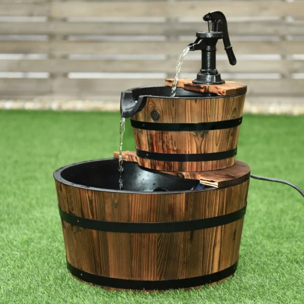 Sodo fontanas 44,5×44,5x61cm, rudos/juodos spalvos – praktiškas ir patvarus sprendimas jūsų sodui ar kiemui. Natūrali eglės mediena ir dviejų pakopų medinės statinės sukuria ramybės atmosferą, o reguliuojamas vandens siurblys užtikrina nuolatinį vandens cirkuliavimą.