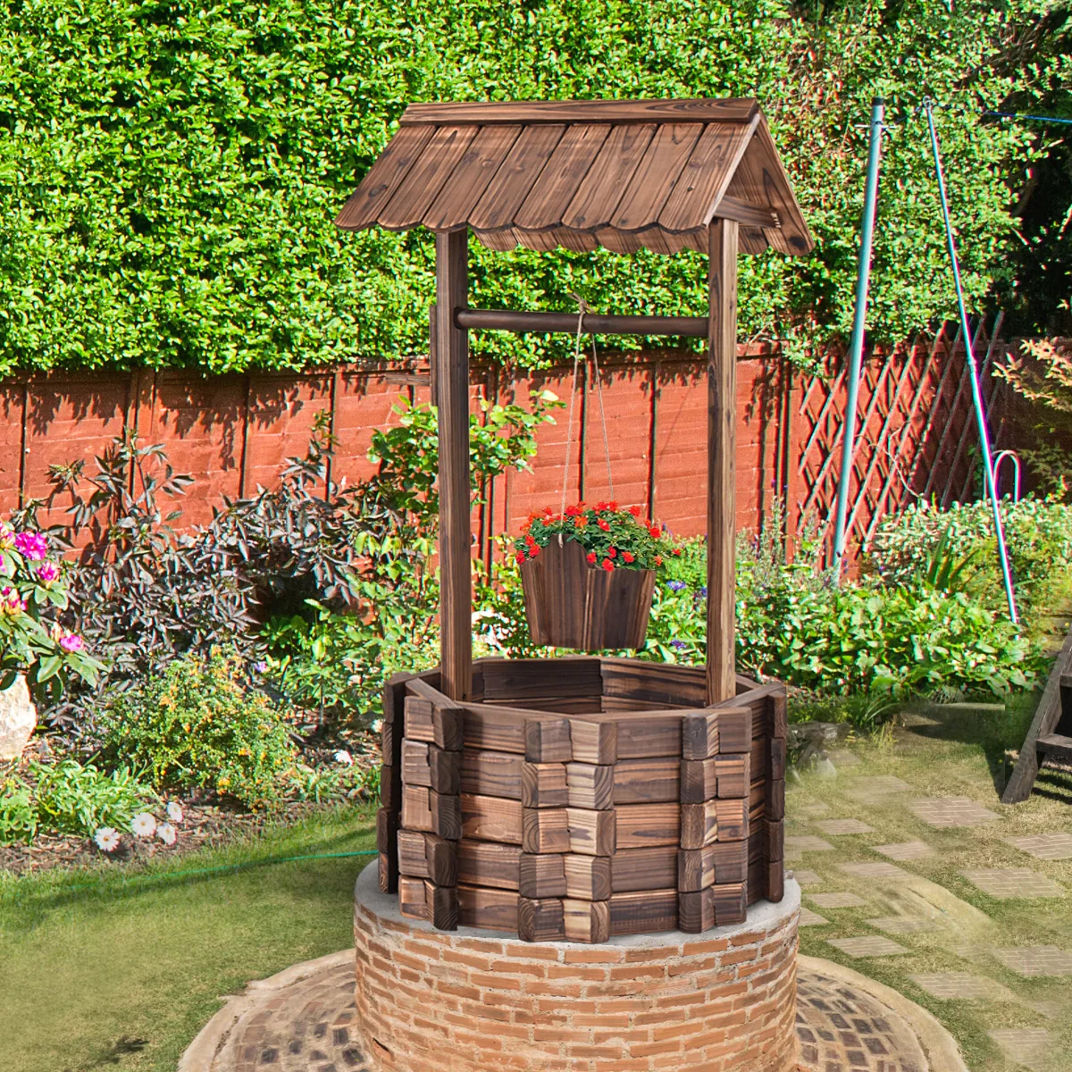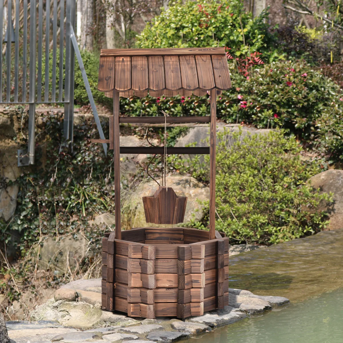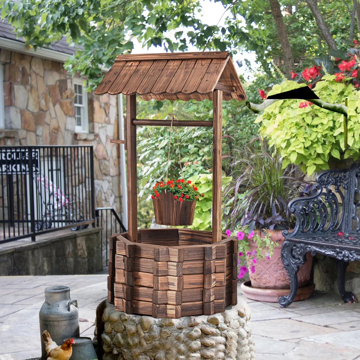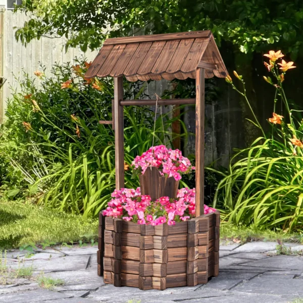 Sodo fontanas 56x56x114cm, rudos spalvos – funkcionalus ir natūralios medienos gaminys, skirtas lauko erdvėms papuošti. Šis medinis fontanas su kibiru puikiai tinka sodo, kiemo ar vejos dekoravimui bei augalų sodinimui.