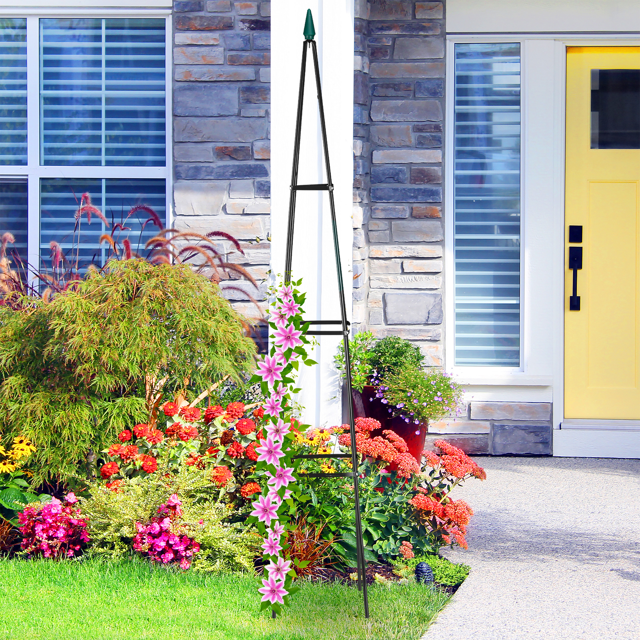 Be to, grotelės gali būti naudojamos ir praktiškiems tikslams, pavyzdžiui, pomidorų ar kitų krūmų auginimui. Vizualiai rožių bokštas žavi savo dekoratyviu antgaliu ir paprastu juodos spalvos dizainu, kuris subtiliai pabrėžia jūsų augalų grožį, nepavogdamas jų pasirodymo.