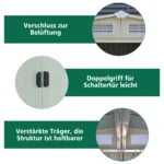 • Stumdomos durys leidžia patogiai pasiekti vidų, durys gali būti užrakintos pakabinama spyna (nepridedama).