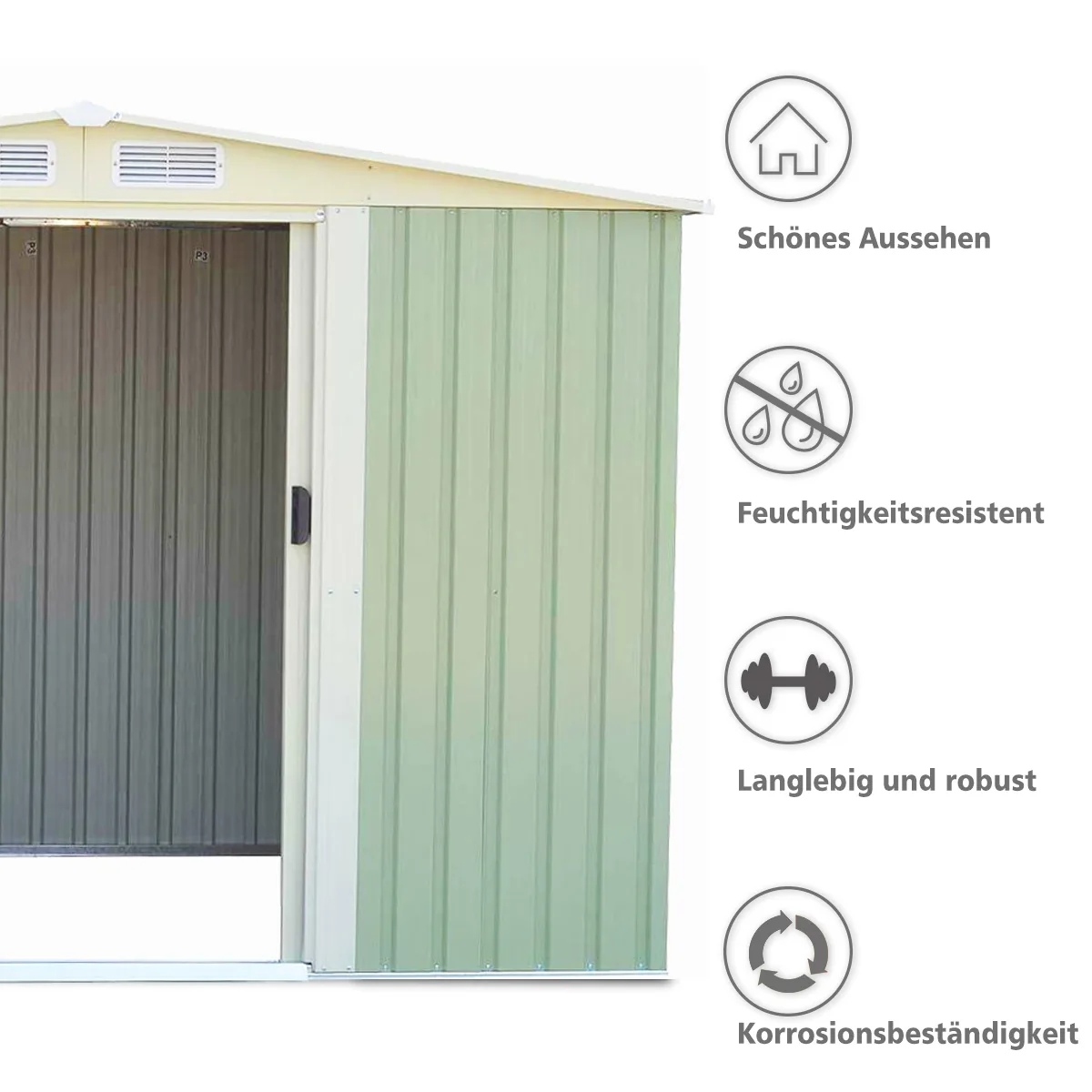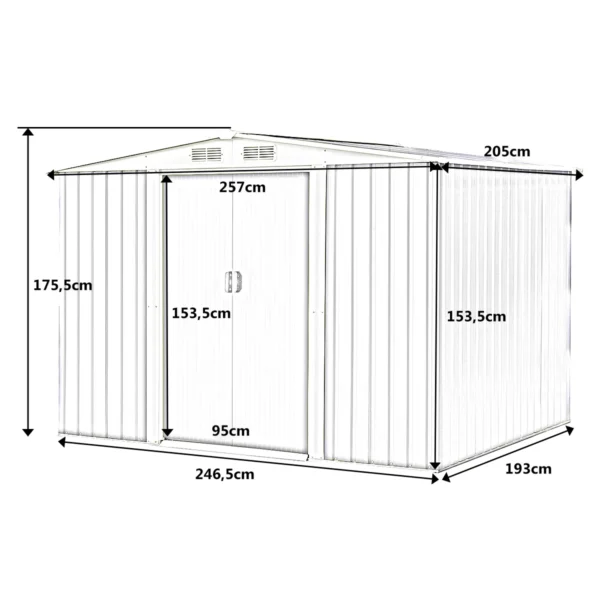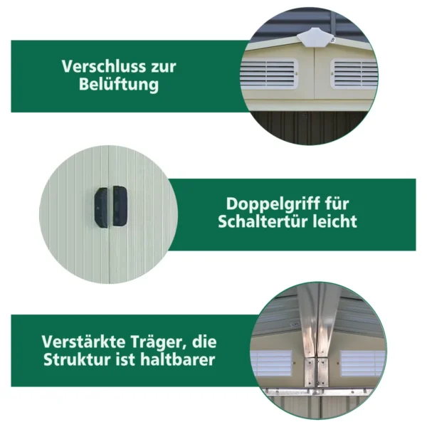 Sodo sandėliukas 205x257x175,5 cm žalios spalvos yra praktiška papildoma saugojimo vieta sodo įrankiams, dviračiams ir kitiems daiktams. Konstrukcija pagaminta iš cinkuoto plieno, užtikrinanti ilgaamžiškumą ir atsparumą korozijai. Dvišlaitis stogas ir ventiliacijos angos palaiko optimalią vidinę aplinką.