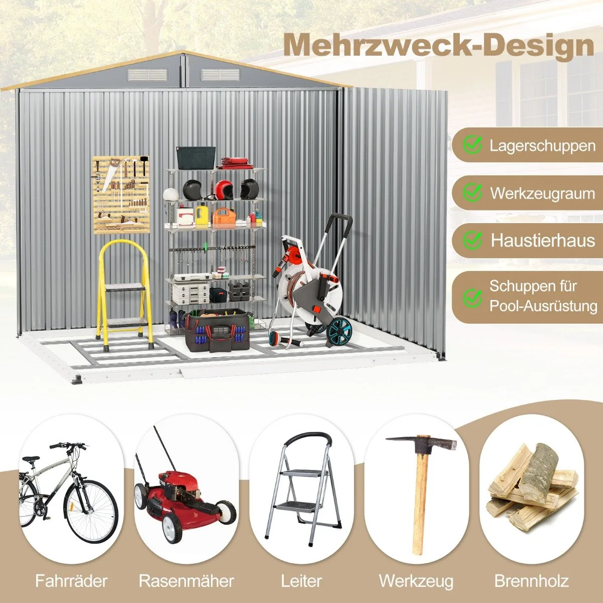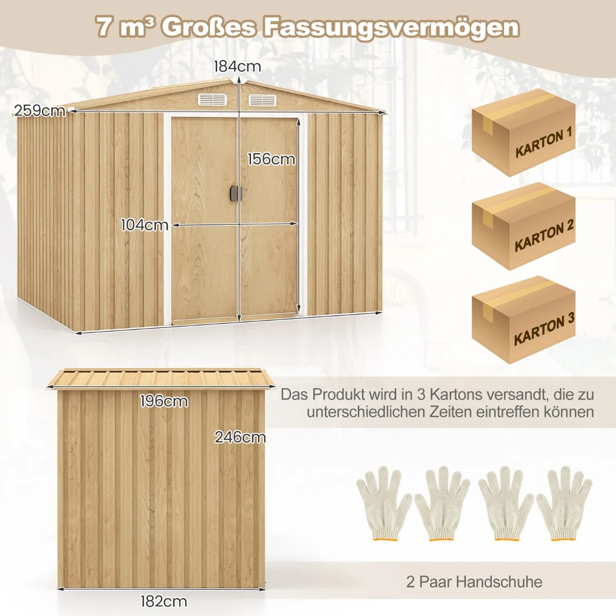 Sodo sandėliukas 259x196x184 cm šviesiai rudos spalvos yra praktiškas sprendimas lauko įrankių, dviračių, vejapjovių ir kitų daiktų saugojimui. Metalinė konstrukcija užtikrina atsparumą rūdims ir oro sąlygoms, o tamsiai ruda spalva su medienos grūdų raštu dera prie bet kokio kiemo.