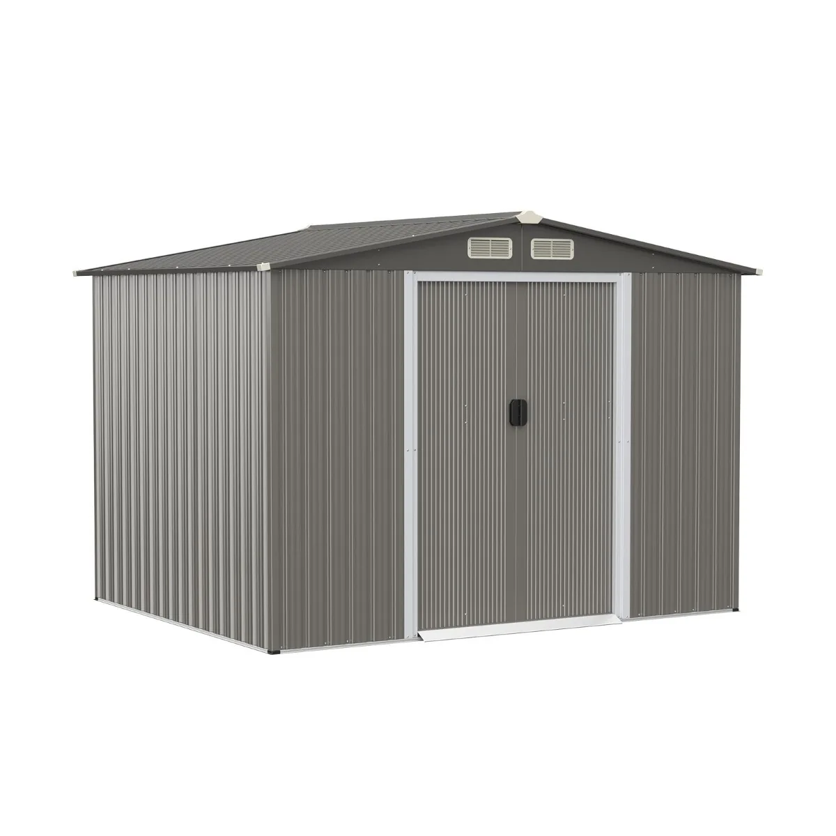 Sodo sandėliukas 260x207x181cm, pilkos spalvos, yra praktiška lauko saugojimo vieta įvairiems įrankiams, dviračiams ir kitiems daiktams. Pagamintas iš cinkuoto plieno su spalvoto plieno čerpių stogu, jis užtikrina atsparumą oro sąlygoms ir tinka sodui, kiemui ar šiukšlių dėžių pastogei.