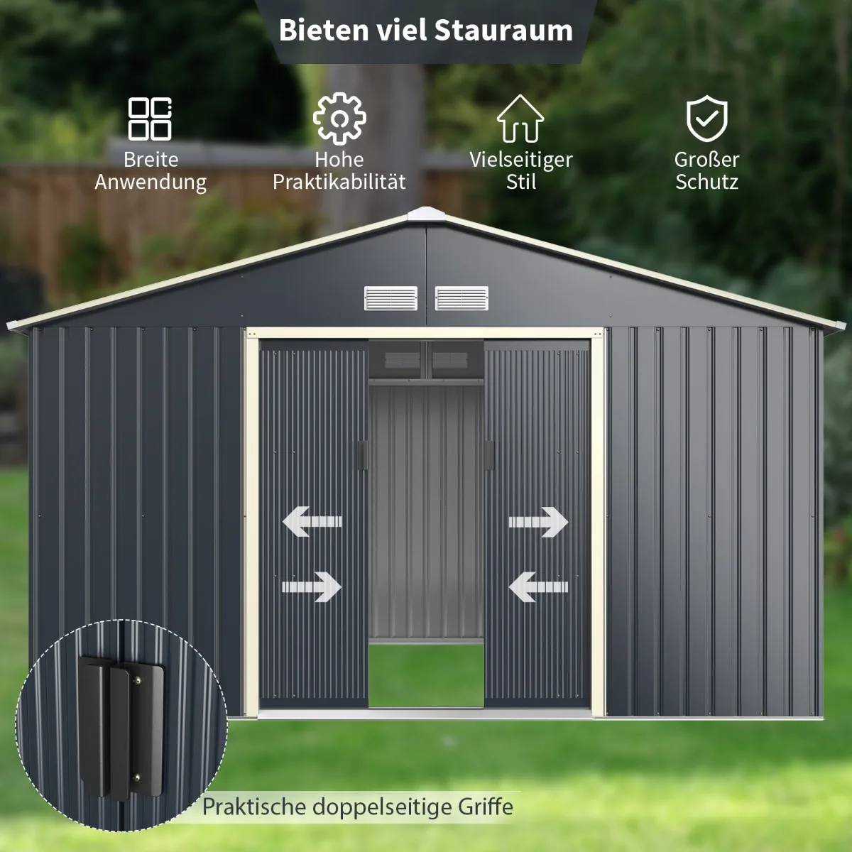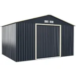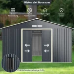 Sodo sandėliukas 340x255x210 cm tamsiai pilkos spalvos yra praktiškas sprendimas įrankiams, vejapjovėms, dviračiams ar šiukšlėms laikyti. Milteliniu būdu dengtas plienas užtikrina tvirtumą ir atsparumą lauko sąlygoms, o stumdomos durys leidžia patogiai patekti vidun bei jas užrakinti dėl saugumo.