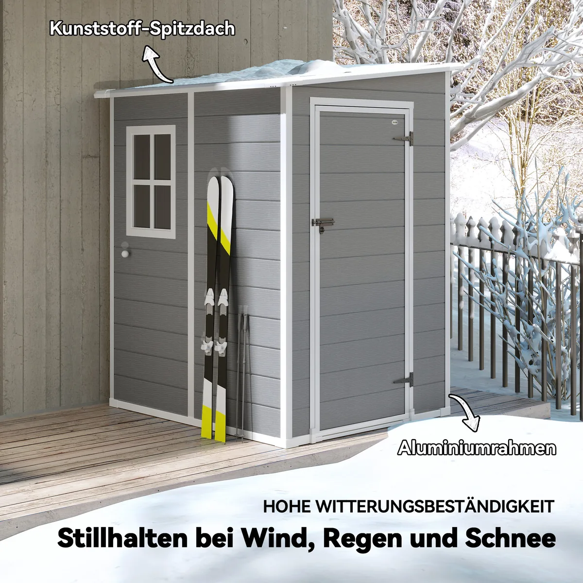 - ✔ Tvirtas aliuminio kraštas ir plastikinis sodo namelio karkasas užtikrina tvirtą šerdį, šlaitinis stogas neleidžia kauptis vandeniui