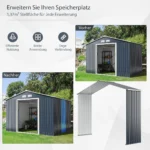 Sodo sandėliuko prailginimo stogas 277x202x64 cm, tamsiai pilkos spalvos, skirtas naudoti lauko sąlygomis. Milteliniu būdu dengtas plienas užtikrina konstrukcijos tvirtumą ir atsparumą oro sąlygoms. Šis priestatas yra tinkamas laiko įrankiams, dviračiams, gyvūnams ar šiukšlėms, suteikdamas papildomą apsaugą ir patogumą.