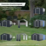 Sodo sandėliuko prailginimo stogas 340x64x210 cm tamsiai pilkos spalvos skirtas pratęsti įrankių namelio plotą. Šis plieninis priedas padidina sandėliuko funkcionalumą ir užtikrina apsaugą nuo lietaus bei kitų oro sąlygų. Tamsiai pilka spalva dera su įvairiais lauko įrankių nameliais.
