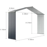 - Įrankių namelis su prailginimu: 340 x 319 x 210 cm (Plotis x Gylis x Aukštis)