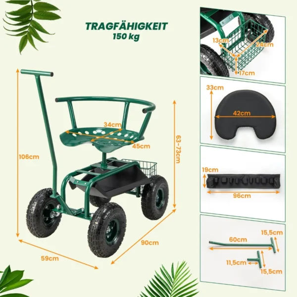 Sodo sėdynė ant ratukų 90x59x106 cm, žalios ir juodos spalvos, padeda patogiai ir efektyviai atlikti sodo darbus be kenksmingo lenkimosi. Reguliuojamo aukščio sėdynė su 360° pasukimu ir praktišku įrankių laikymo sprendimu užtikrina komfortą ilgalaikiam darbui. Tvirta konstrukcija ir pripučiamos gumos padangos palengvina judėjimą įvairiomis dangomis.