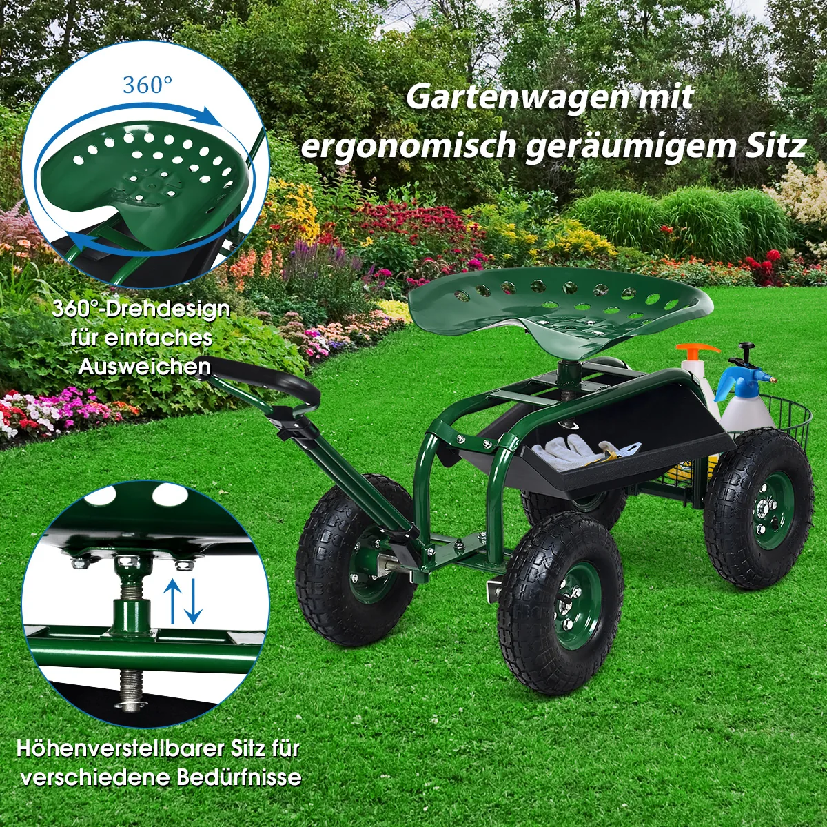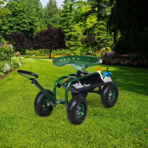 Sodo sėdynė ant ratukų 96,5×47,5×53 cm, žalia/juoda spalvos, skirta patogiam darbui sode. Tvirtas metalinis rėmas su milteliniu dengimu ir pripučiamos gumos padangos užtikrina stabilumą ir lengvą manevravimą. Ergonomiška sėdynė bei reguliuojama vairo rankena padeda sumažinti nuovargį dirbant lauke.