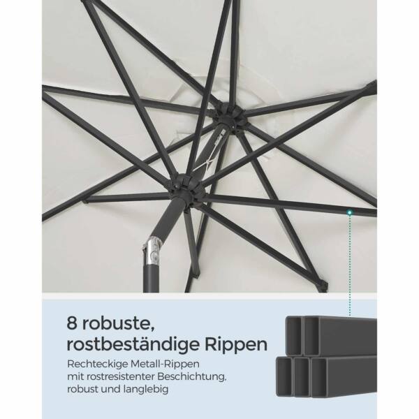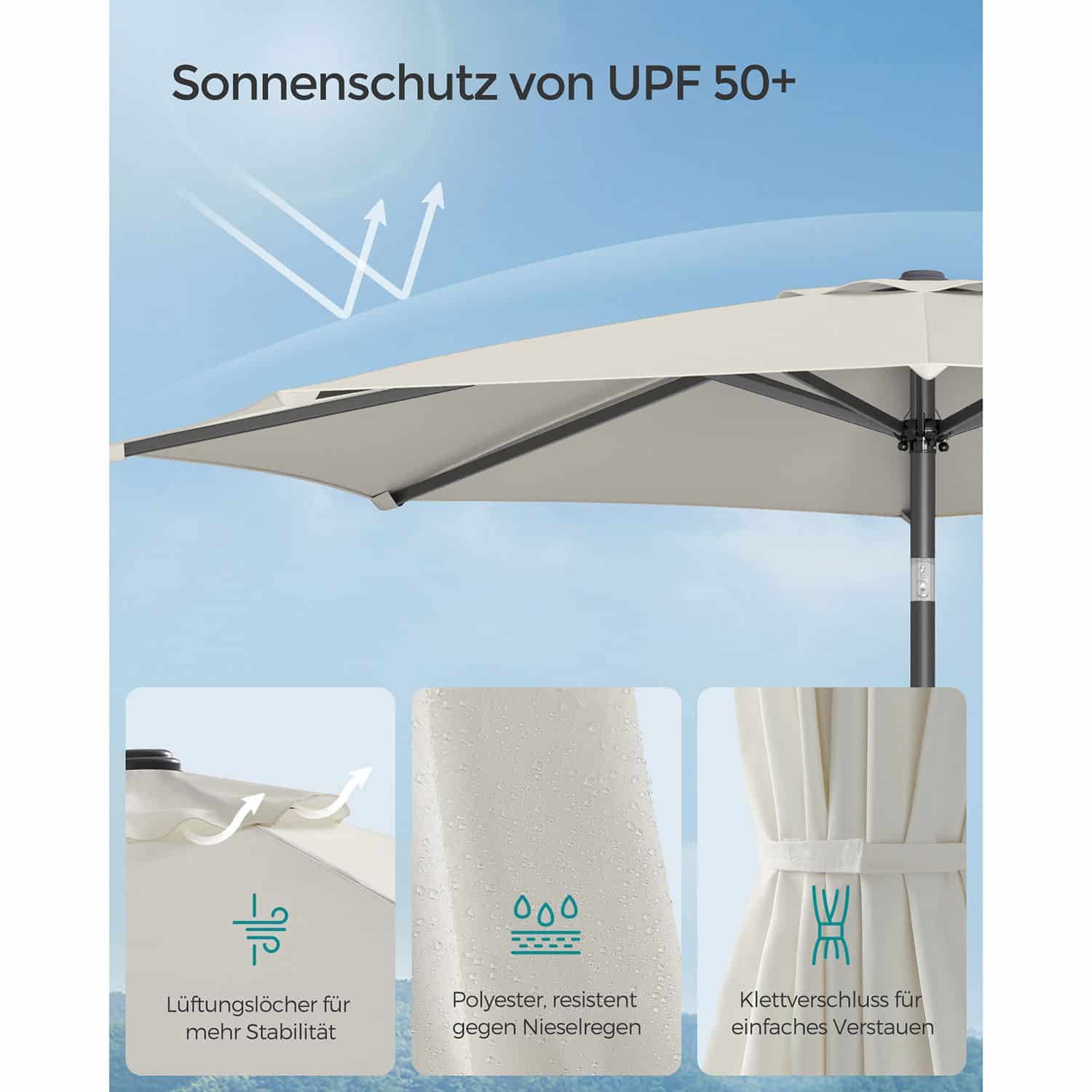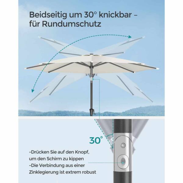 Skėčio audinio kreivė siekia 340 cm, o horizontalus skėčio audinio skersmuo yra 327,5 cm, todėl jis suteiks pakankamai šešėlio jūsų poilsiui.