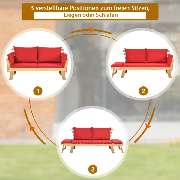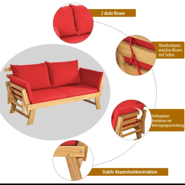 Sodo sofa 198x75x75cm., šviesiai rudos/raudonos spalvos yra patogi lauko kiemo kušetė, pagaminta iš tvirtos akacijos medienos. Ji skirta kasdieniam naudojimui soduose, terasose ar balkonuose, prisitaikant prie įvairių poreikių dėl reguliuojamų porankių ir ergonomiško dizaino.