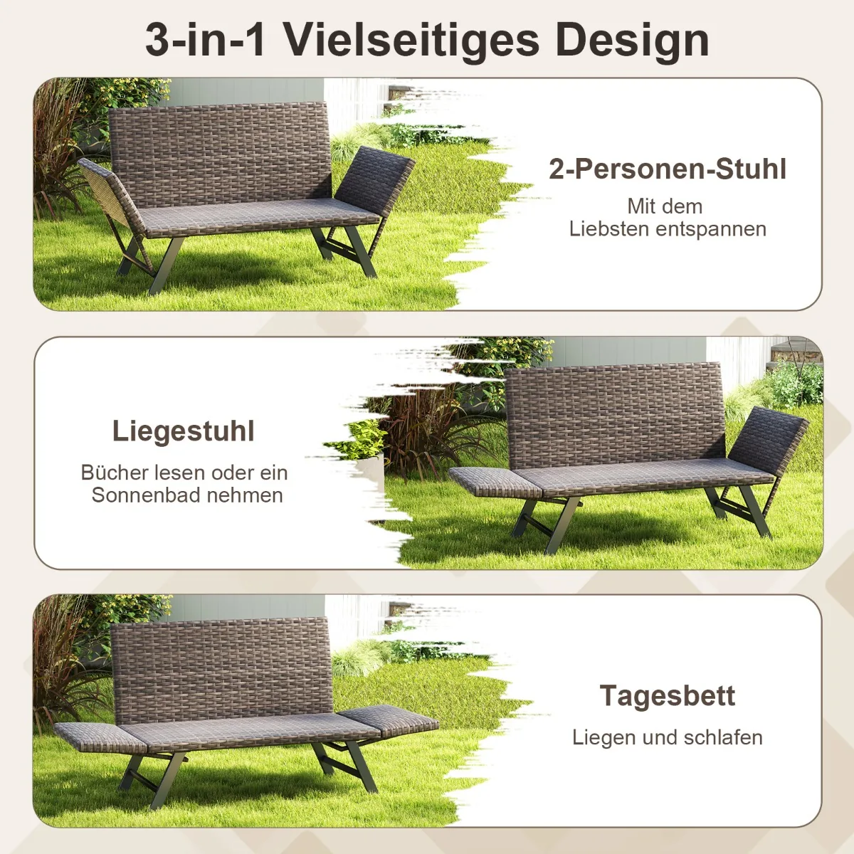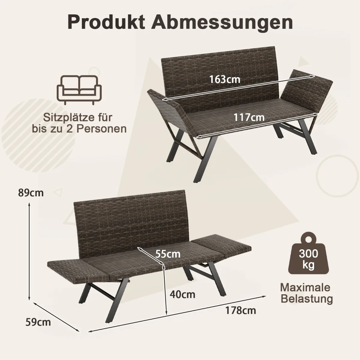 Sodo sofa 59x178x89cm, rudos/juodos spalvos – praktiškas lauko baldas, skirtas poilsiui sode, prie baseino ar terasoje. Reguliuojamais porankiais ir patogiomis sėdimomis vietomis ši sofa lengvai transformuojasi į gultą ar kušetę, prisitaikydama prie skirtingų poreikių. Konstrukcija su PE rotango apdaila ir metaliniu rėmu užtikrina ilgaamžiškumą ir komfortą lauko sąlygomis.