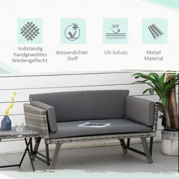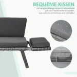 Ši moderni „Outsunny“ rotango sofa pasižymi paprastu, nesenstančio dizainu ir aukštos kokybės apdaila. Dėl tvirto, nerūdijančio plieno rėmo ir patvarios oro sąlygoms atsparios dirbtinio rotango dangos ši sodo sofa puikiai tinka naudoti lauke ištisus metus. Porankius galima lengvai nulenkti, kad galėtumėte patogiai atsigulti arba naudoti šonines plokštes kaip praktiškas laikymo vietas.