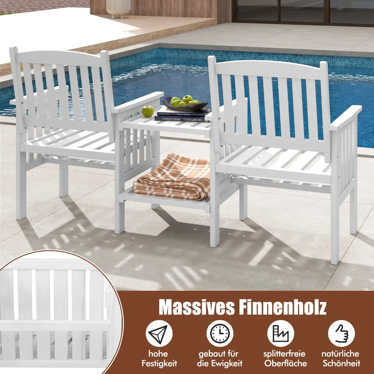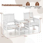Sodo suolas su staliuku 165x60x88 cm, baltos spalvos, puikiai tinka lauko erdvėms – terasoms, balkonams ar kiemams. Pagamintas iš natūralios eglės medienos, šis komplektas apjungia dvi kėdes su porankiais ir dviejų lygių šoninį staliuką, pasižymintį patvarumu ir funkcionalumu. Integruota skylė skėčiui suteikia komforto saulėtoms dienoms.