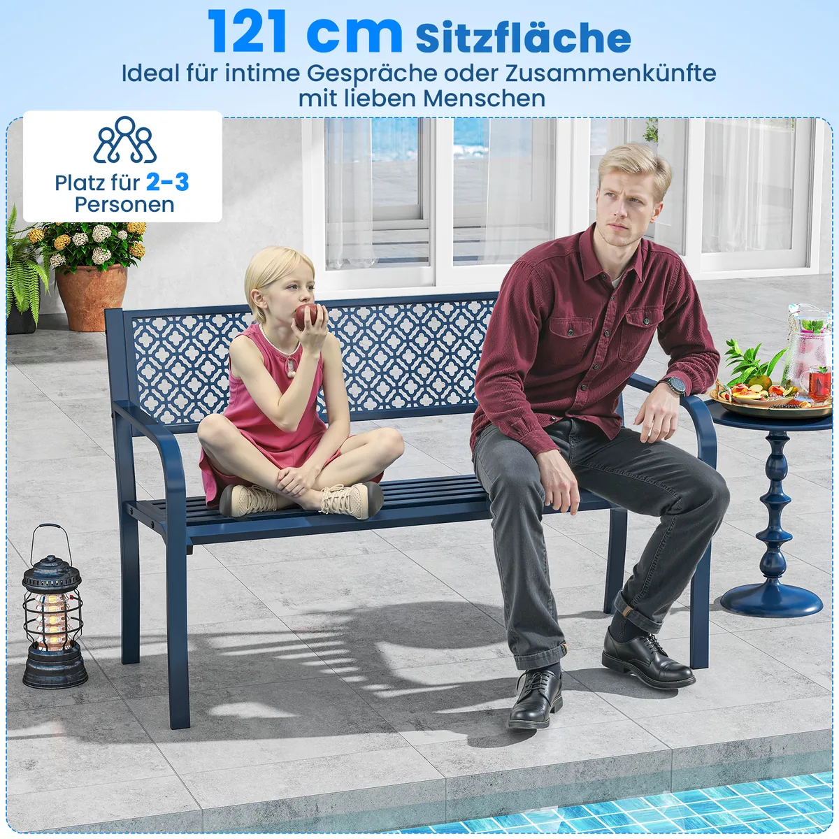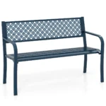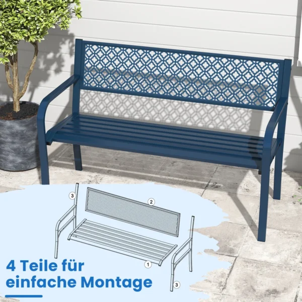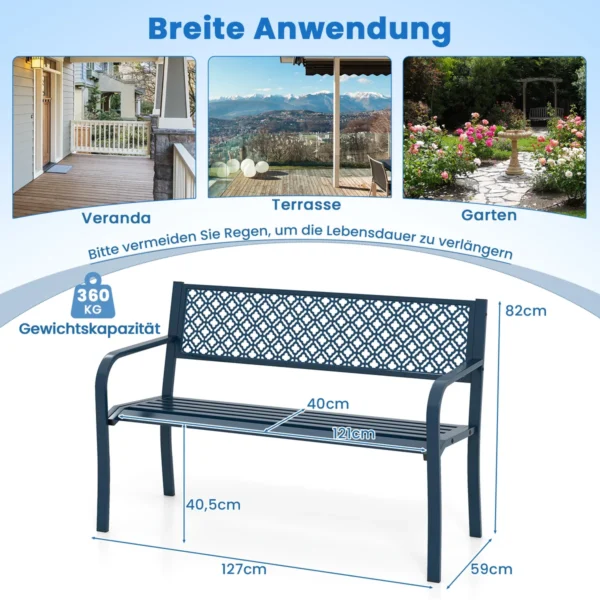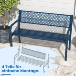Sodo suoliukas 127x59x82cm, mėlynos spalvos – praktiškas ir patvarus sprendimas jūsų sodui, terasai ar verandai. Šis metalinis suoliukas skirtas patogiam poilsiui lauke, talpina 2-3 žmones ir išsiskiria dideliu stabilumu bei ergonomišku dizainu.