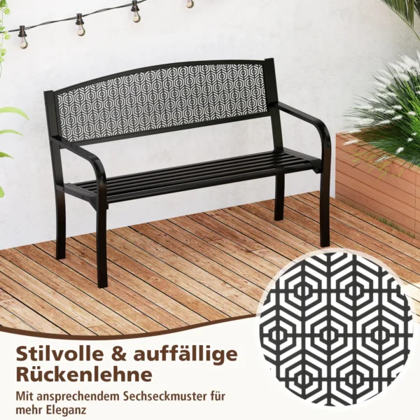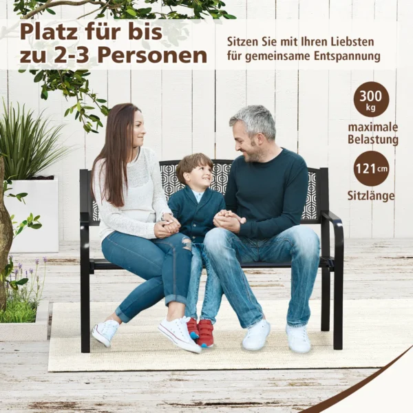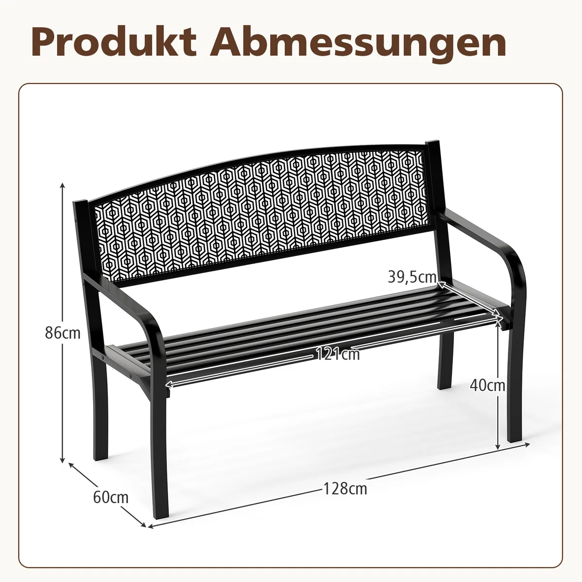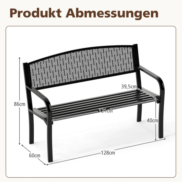 Sodo suoliukas 128x60x86cm, juodos spalvos, puikiai tinka jūsų lauko erdvėms – sodui, terasai ar prie baseino. Metalinė konstrukcija užtikrina tvirtumą ir atsparumą oro sąlygoms. Erdvi 121 cm sėdynė leidžia patogiai sėdėti 2-3 asmenims, o ergonomiškas dizainas suteikia komfortą ilgesniam poilsiui.