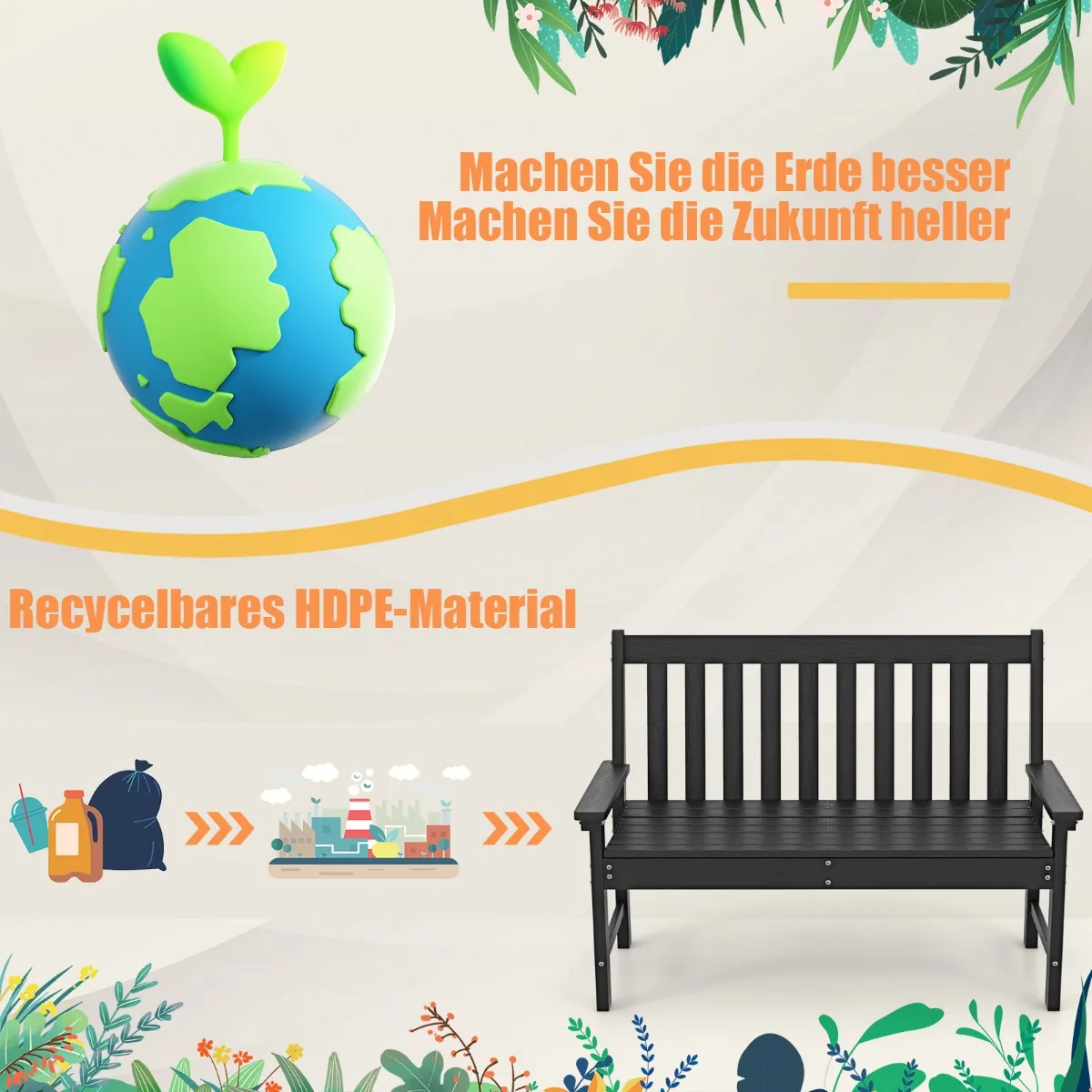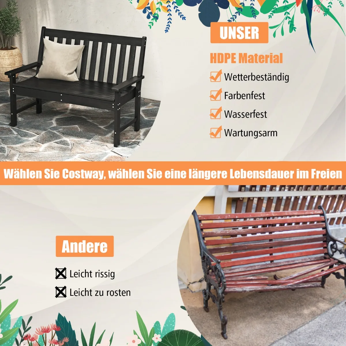 Sodo suoliukas 132x65x91 cm, juodos spalvos, skirtas naudoti lauke ir užtikrina patvarumą bei komfortą. Pagamintas iš atsparios oro sąlygoms HDPE medžiagos, šis suoliukas puikiai tinka sode, kieme ar verandoje. Dėl didelės apkrovos ir ergonomiškos konstrukcijos tinka sėdėti dviem žmonėms vienu metu.