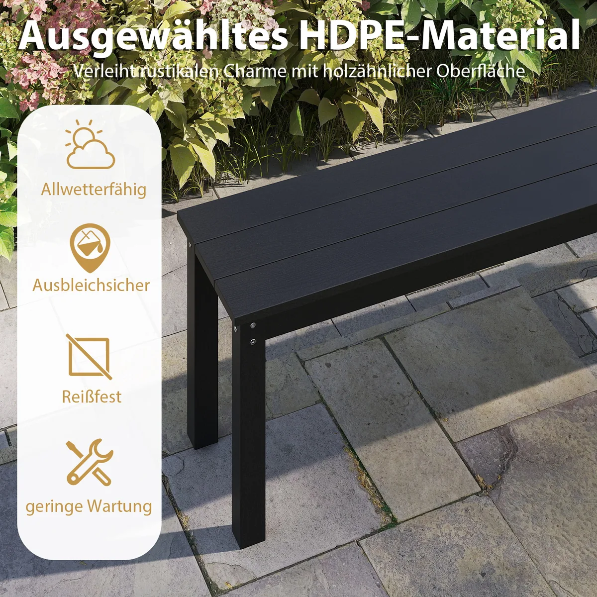 Sodo suoliukas 140x35x45cm juodos spalvos yra praktiškas sprendimas lauko erdvėms. Pagamintas iš oro sąlygoms atsparios HDPE medžiagos, jis tinkamas naudoti verandoje, sode ar denyje. Be atlošo, šis suoliukas užtikrina patogų sėdėjimą iki 3 asmenų.