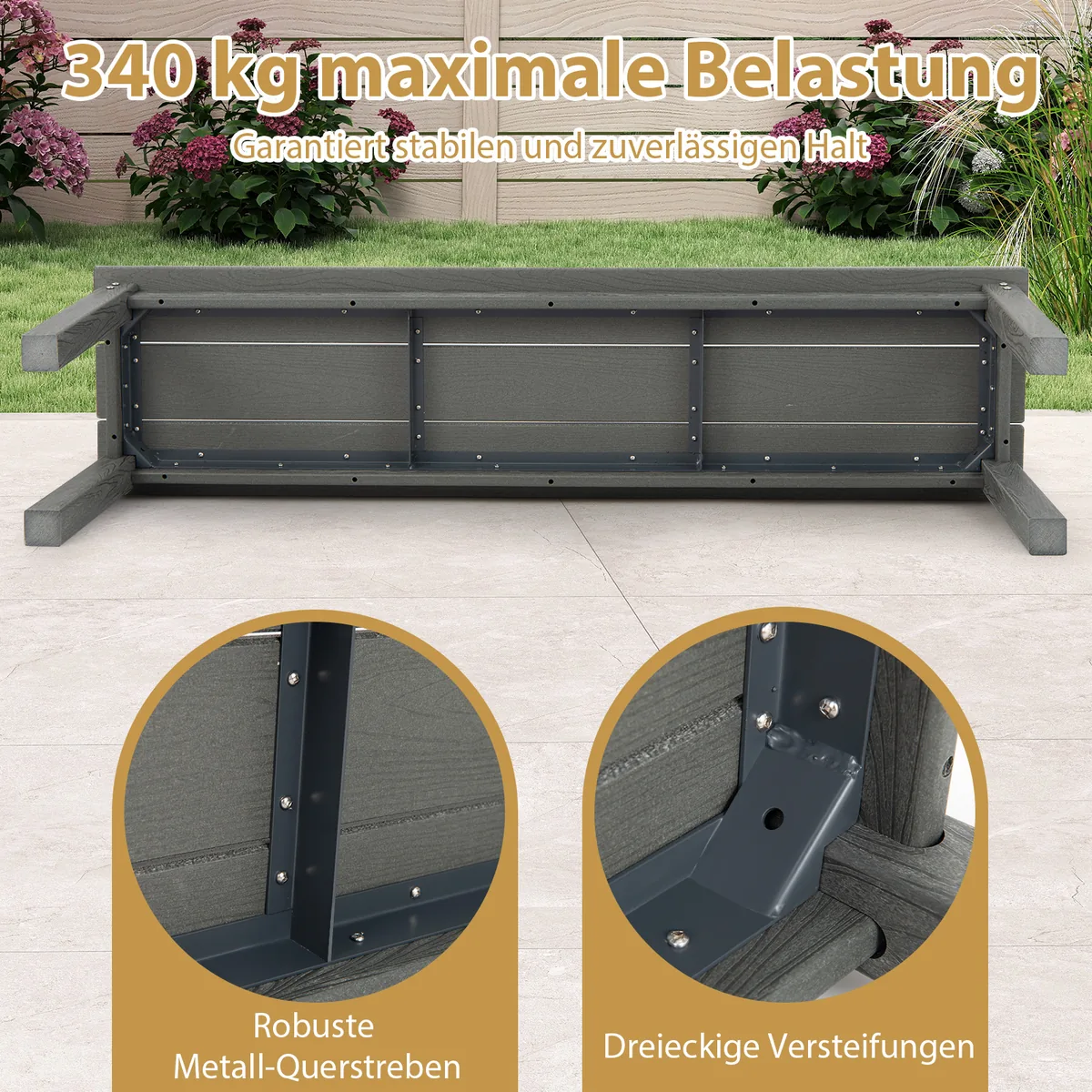 - Tvirtas rėmas su metaliniais skersiniais ir trikampiais sutvirtinimais, užtikrinantis iki 340 kg apkrovą.