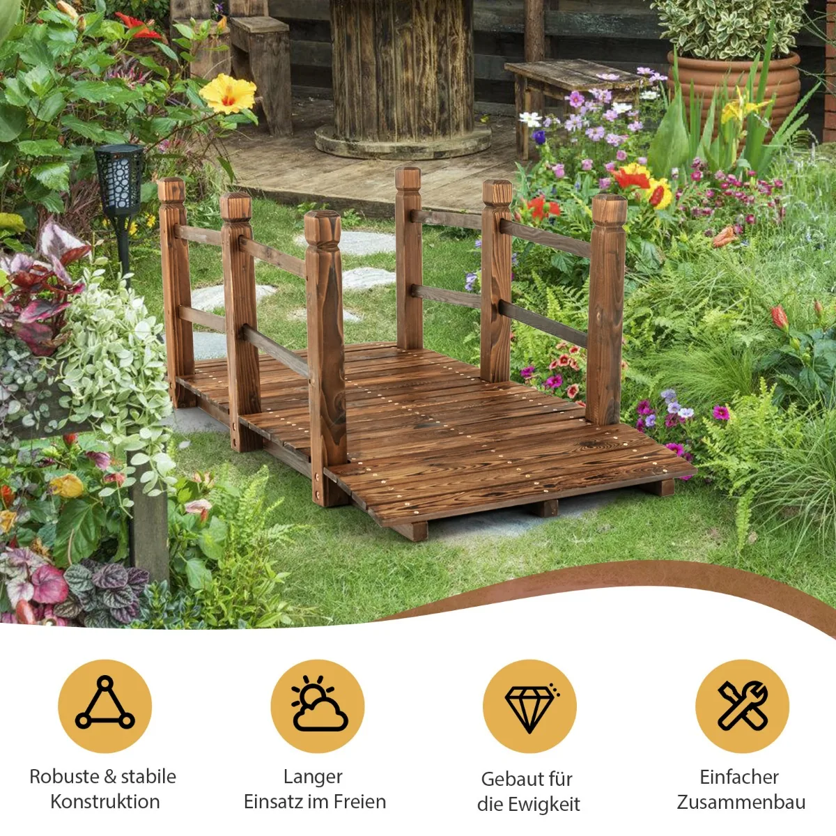 Sodo tiltas 150x67x55 cm, rudos spalvos, yra praktiškas ir ilgaamžis sprendimas jūsų lauko erdvei. Pagamintas iš eglės medienos su karbonizuotu paviršiumi, tiltas atsparus oro sąlygoms ir skirtas naudoti įvairiose sodo vietose. Jo konstrukcija užtikrina stabilumą ir saugumą kertant mažus upelius ar takus.
