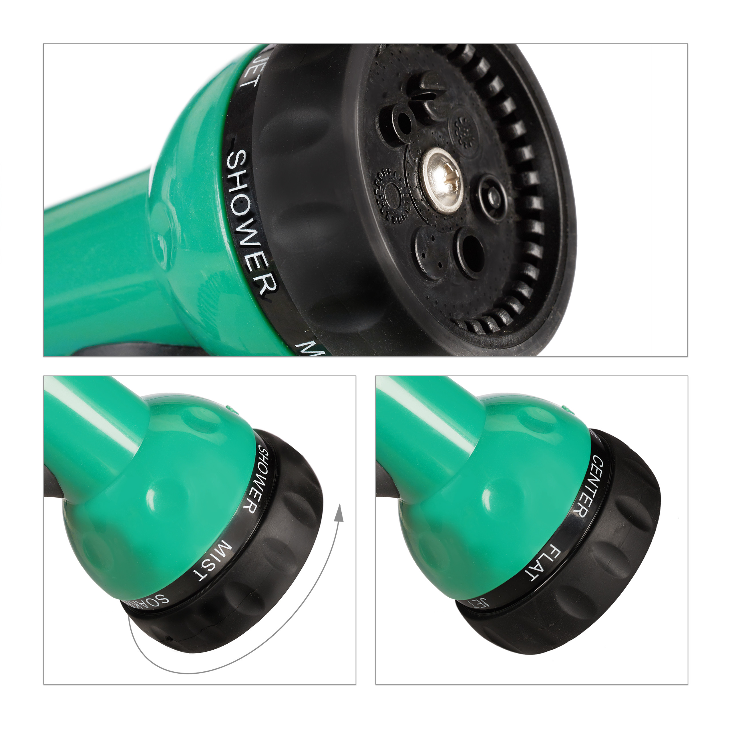 Purkštuvas: Komplekte yra sodo žarnos purkštuvas su 7 reguliuojamais purkštukų tipais, leidžiančiais pasirinkti tinkamiausią laistymo būdą jūsų augalams.